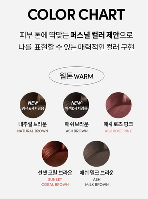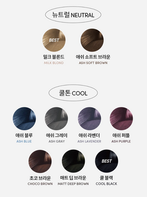 Ash Gray, Matte Deep Brown, Natural Brown, Milk Blonde, Sunset Coral Brown, Cool Black, Choco Brown, Ash Purple, Ash Soft Brown, Ash Blue |